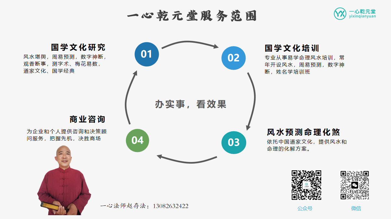 我们研究易经为客户服务,如果没有准确性,光吹牛逼,那会被钉在历史的耻辱柱上。所以多年来,一心乾元堂在赵存法老师带领下,一直坚守“办实事、看效果”的服务理念,致力于国学标准化、现代化、实战化。